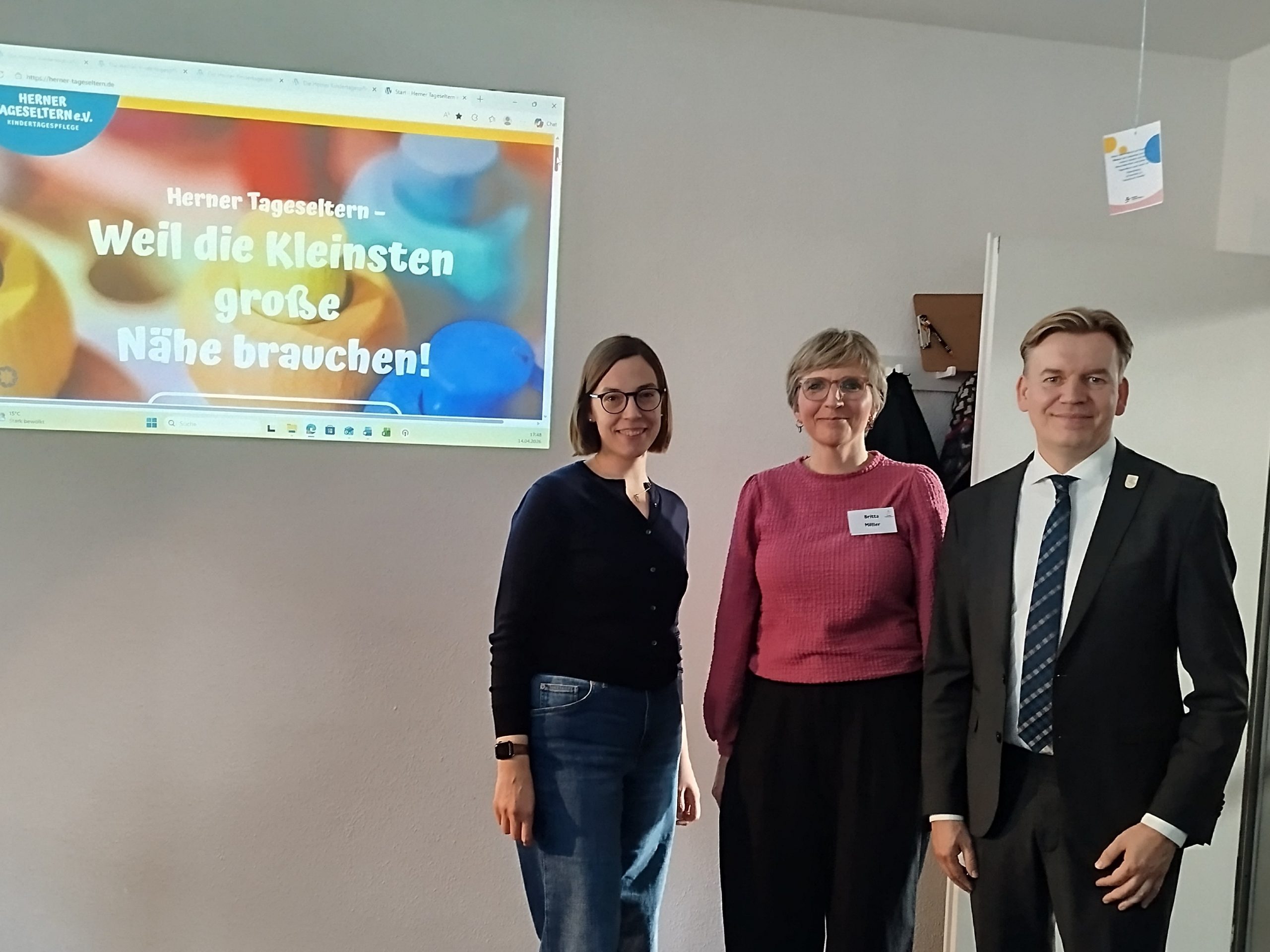 Wir begrüßten Kindertagespflegepersonen, Kooperationspartner und Gäste aus der Politik wie Theres Boneberger, Vorsitzende des AKJ, Mathias Grunert, Bezirksbürgermeister von Herne-Mitte und Sodingen (Foto: neben Teamleiterin Britta Möller (Mitte)) sowie Kirsten Wietoska, Leitung des Fachbereiches Kinder, Jugend und Familie.